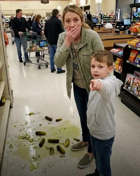 I turned slowly. Behind me were a woman and a little boy, maybe seven. The boy stared at me with wide, curious eyes, while the woman’s face drained of color. She looked as if she had seen a ghost, and the jar of pickles she was holding slipped from her hands and shattered on the floor.