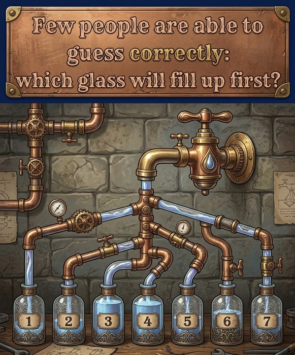 At first glance, the puzzle seems easy: several glasses are linked by pipes, water is pouring in, and the question is simple—which glass will fill up first? But like many visual brainteasers, the answer that looks obvious is often wrong, especially if you rush to decide.