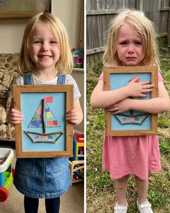 Over three days, she collected twigs, cut colored paper, and used cardboard from a cereal box. She worked on it with intense focus, like it was the most important thing in the world. The final result was a slightly crooked, uneven little boat—but it was hers, made with care and pride.